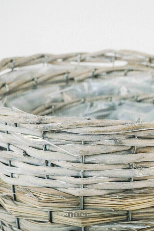 Descrição geral: cachepô de tamanhos diferentes feitos de vime e palha , cada um possui um revestimento interno de plástico , os cachepôs de cor branco e nude