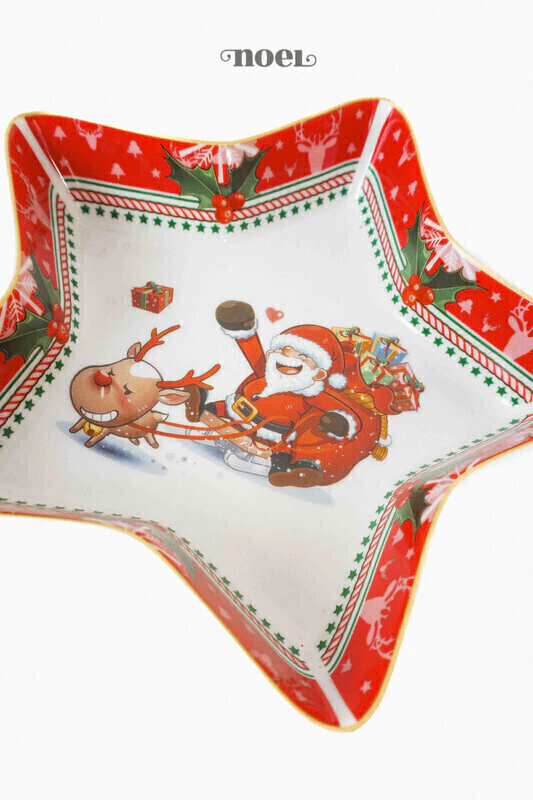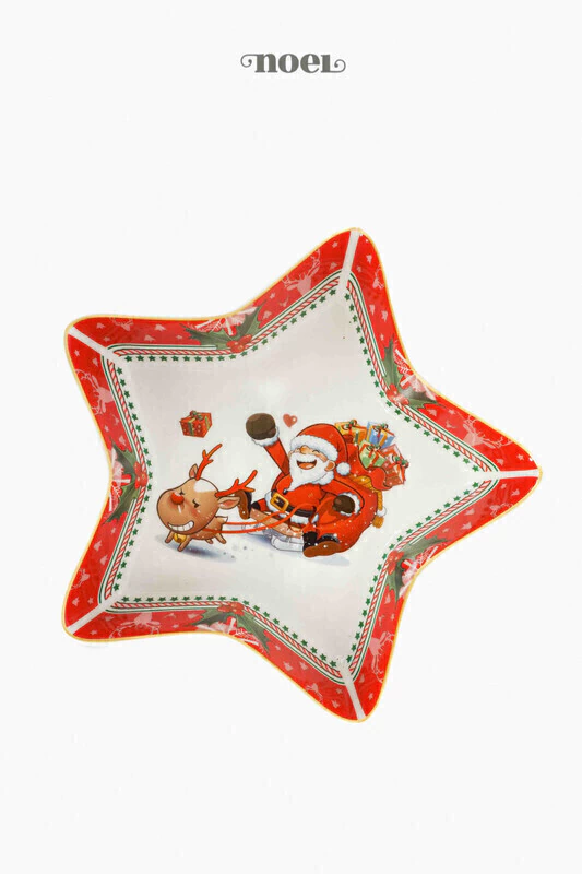 Dimensões do produto - (AxLxP): 17x17x5cm Peso: 286g Material: Porcelana Cor: Branco , Vermelho e nude Descrição geral: Petisqueira em forma de estrela com temática natalina. O prato tem uma borda vermelha decorada com desenhos de renas e árvores de Natal em verde e branco. No centro, há uma ilustração de Papai Noel com um saco de presentes e uma rena Observação: A cor do produto pode sofrer alteração devido à configuração de luz e tela. Produto vendido individualmente. Objetos decorativos utilizados nas fotos não fazem parte do conteúdo da embalagem.