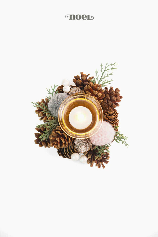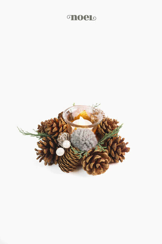 descrição geral: castiçal decorativo com base de poliestireno, com 1 suporte de vidro para vela, com pinhas marrons e galhos verdes e 2 pompons sendo 1 na cor cinza e outro na cor rosa