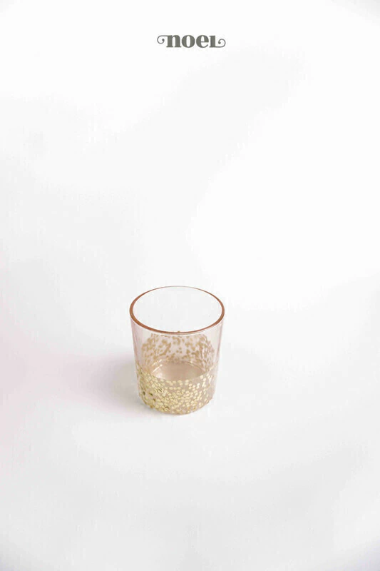 Descrição geral: O porta vela é feito de vidro transparente dourado, permitindo a visualização do seu conteúdo, a parte inferior do porta vela é rosa e adornada com uma textura granulada dourada