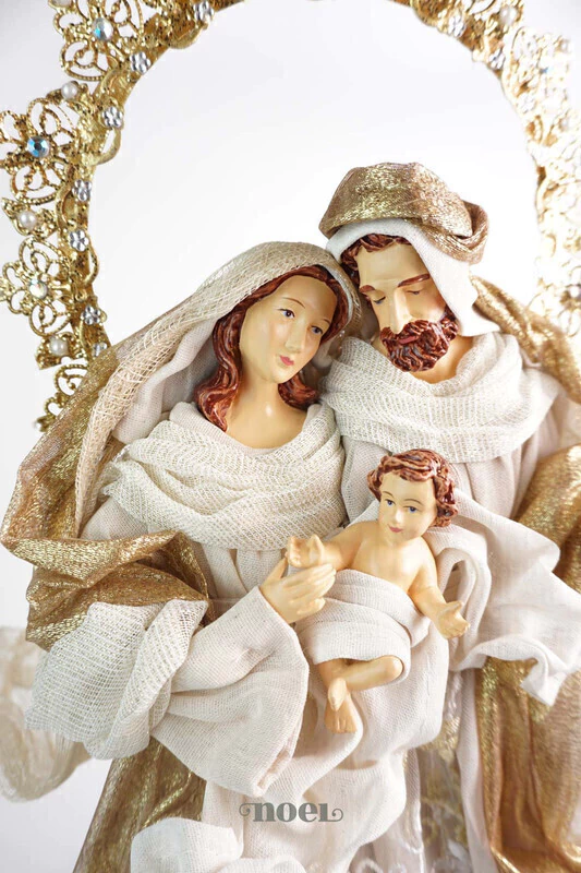 Descrição Geral: Sagrada Família, composta por Maria, José e o menino Jesus, peça é feita , com detalhes em tecido e rendas nas vestes, predominando as cores ,dourado e off-white , a familia tem um arco dourado com pedras , José segurando um cajado , ficam sob uma base de madeira marrom