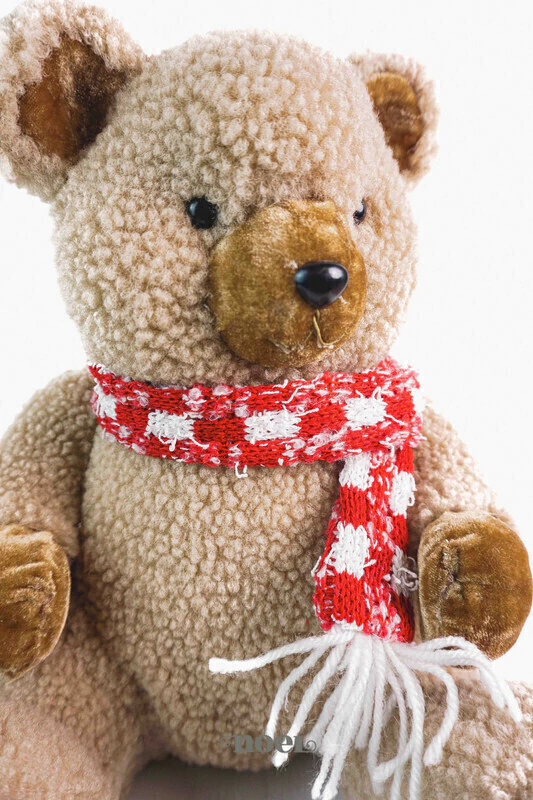 Descrição geral: Urso de pelúcia em tom marrom claro, ele possui detalhes em marrom mais escuro nas patas, focinho e orelhas, criando um contraste suave e natural. O toque natalino fica por conta do charmoso cachecol vermelho com detalhes em branco