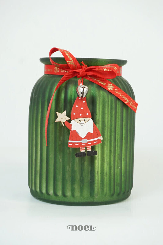 Descrição geral: Vaso de vidro, com textura canelada na cor verde escura.Possui uma fita vermelha com a inscrição "Merry Christmas" amarrada ao redor da boca. Da fita, pende um enfeite de boneco Papai Noel em vermelho e branco, segurando uma estrela.